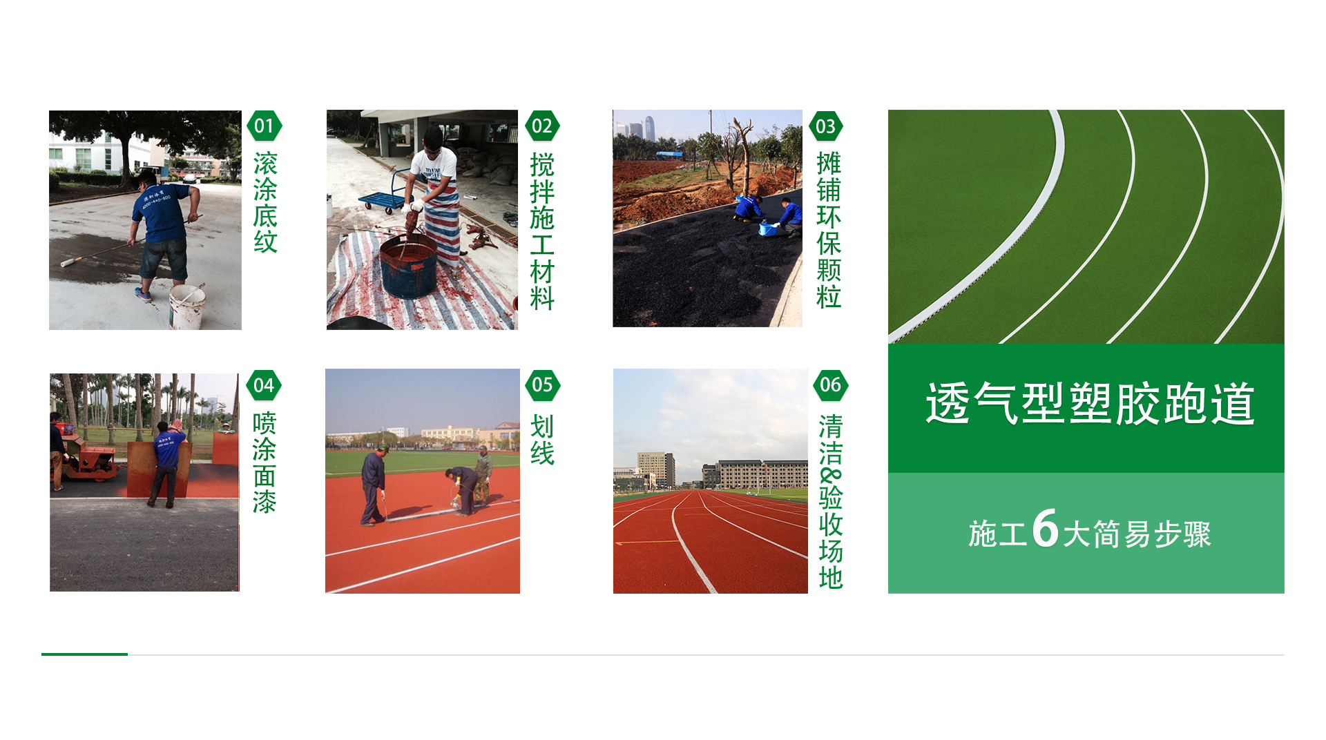 透氣型塑膠跑道由:單組份膠水,環(huán)保顆粒,跑道面漆等材料,經(jīng)過施工師傅按照規(guī)定的材料配比和施工,按標(biāo)準(zhǔn)的施工步驟制作而成。